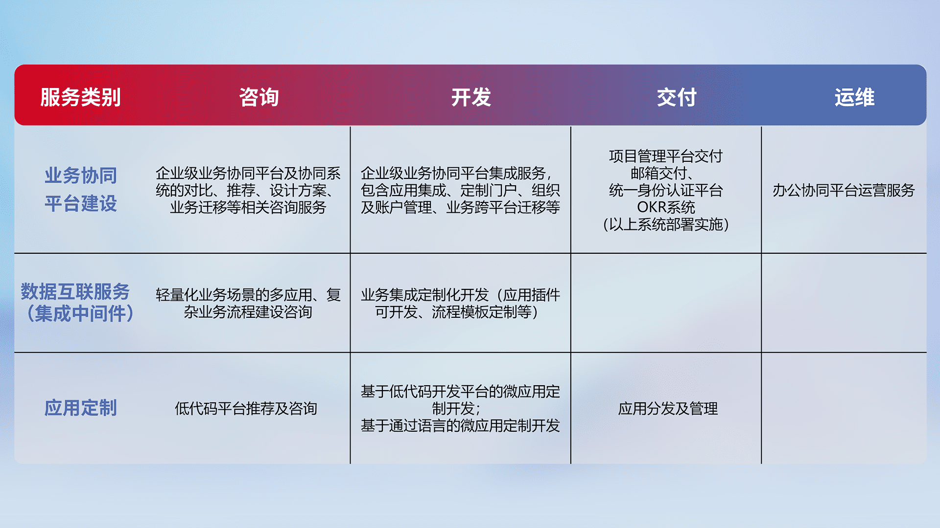 针对钉钉、、、、企微、、、、IDaas等平台级产品提供产品的规划、、方案、、、交付、、、、定制化开发等服务,,,,实现如统一协同办公、、、智能客户服务、、、、混合会议管理、、智能数据查询、、、、等业务场景,,,实现数字化转型。。。。