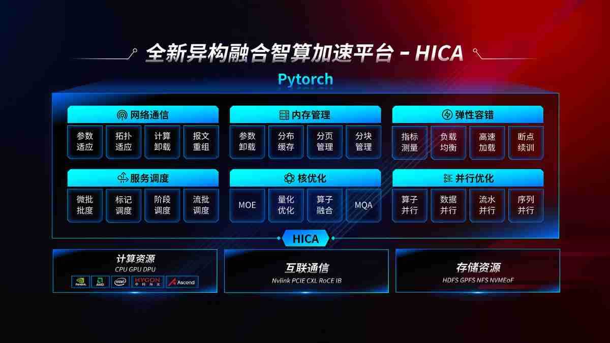 通过自研的服务层、、、中间适配层、、、以及调度编排算法,,,,采用数据并行、、、、模型并行等多种并行方式,,把并行计算任务进行有效的分解,,使其分别由相应的软件栈和算力资源来承接。。。。当GPU资源变化,,,HICA可以实时动态调度计算子任务并调整模型拓扑和架构,,,以充分聚合各种算力资源。。。。