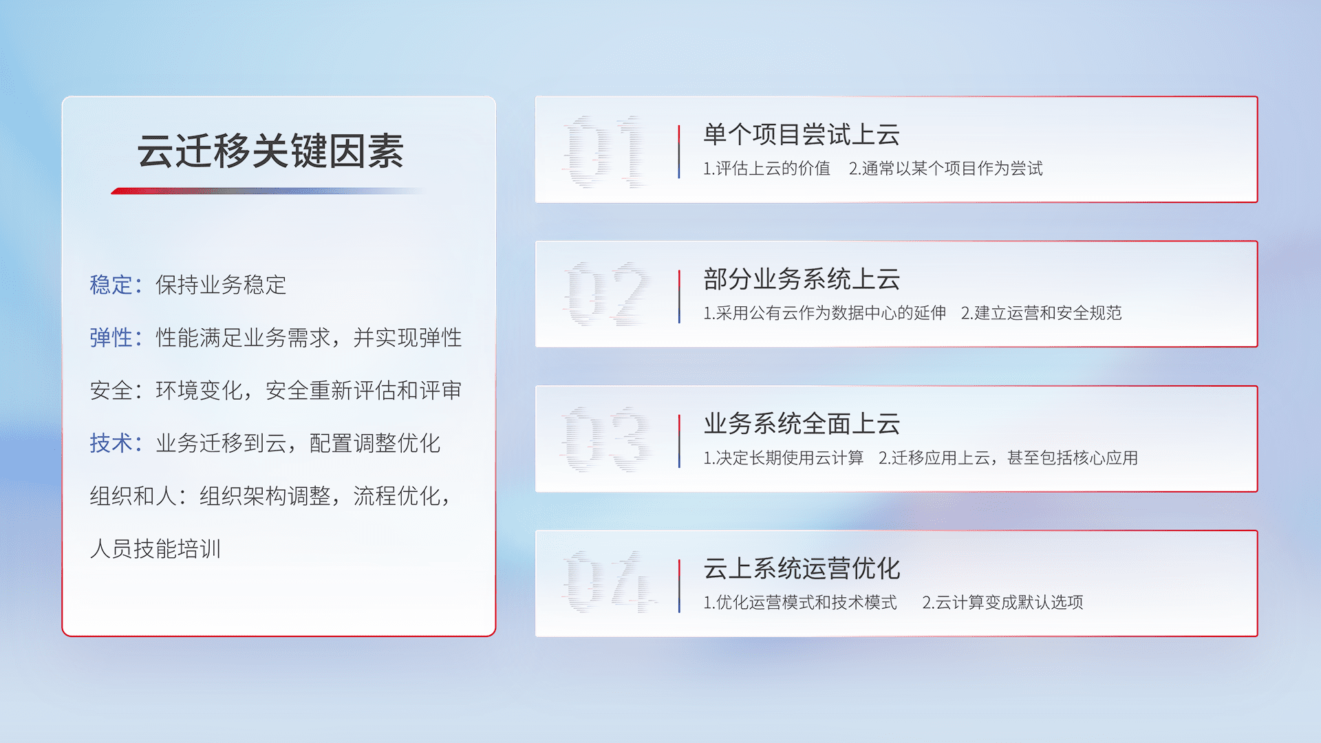 结合实际业务,,,,从规划设计、、、云平台选型、、云原生改造、、、、数据迁移、、、、集成交付,,,迁移全过程为客户识别最佳上云路径,,,,做好风险识别管理,,,,设计网络架构、、、、身份权限、、安全审计合规、、、操作审计、、、、日志审计、、、、监控告警策略、、、、多站点容灾设计等,,,对云上基础设施进行整体规划,,,,提升IT治理水平,,,,以满足弹性、、高可用、、高性能的需求。。。。