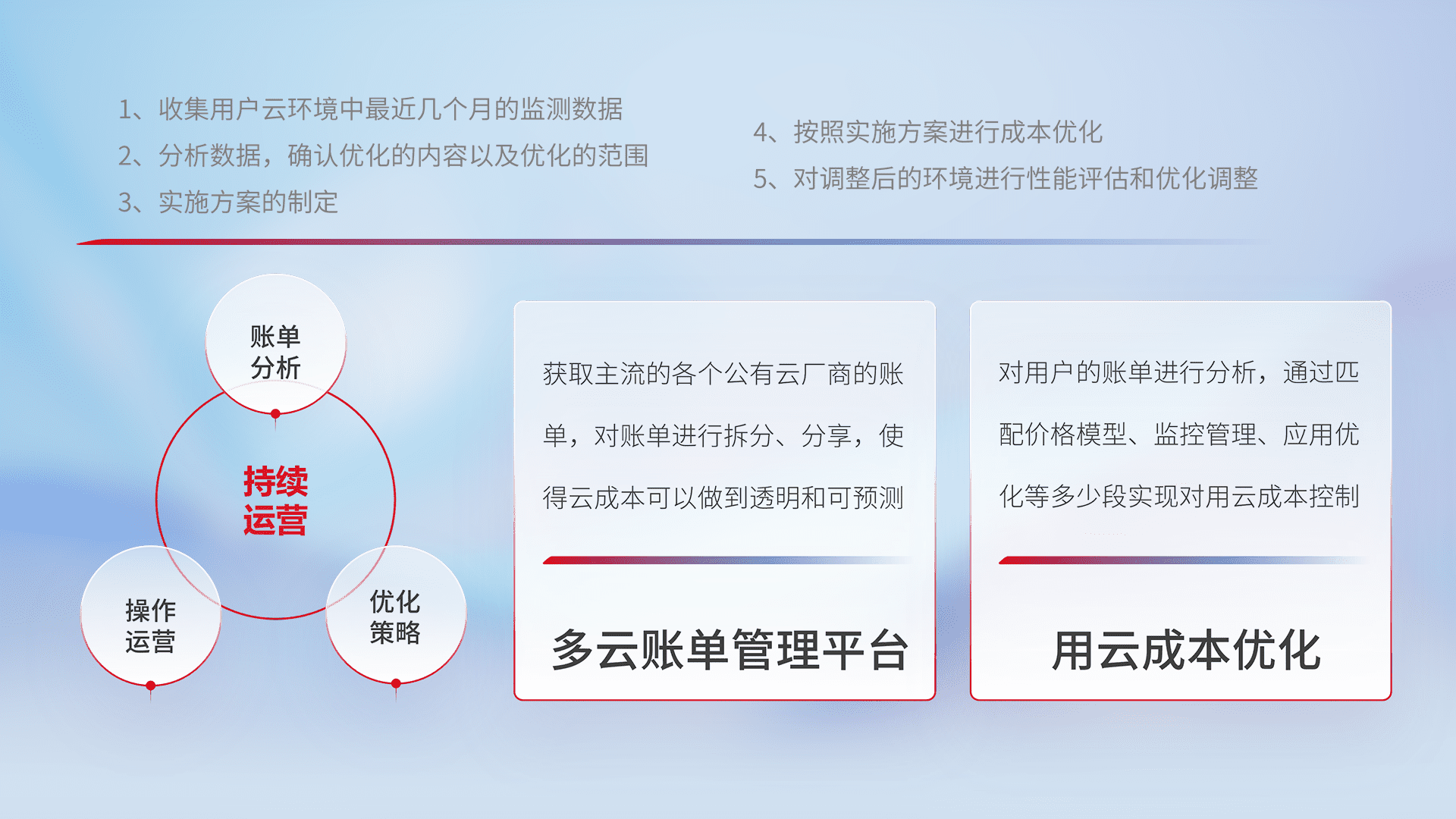 通过多云纳管,,,,以统一的资源数据模型把客户的云资源进行抽象和封装,,,进而实现对多云资源的统一操作,,保障云资源管理的可靠性、、、、稳定性与可用性。。。。量身定制化运维内容,,,配置、、、开发运维、、补丁管理、、备份、、、监控、、、认证和访问管理、、、审计和日常巡检等,,保障在用云过程中的可靠度,,,,稳定度以及高可用率。。